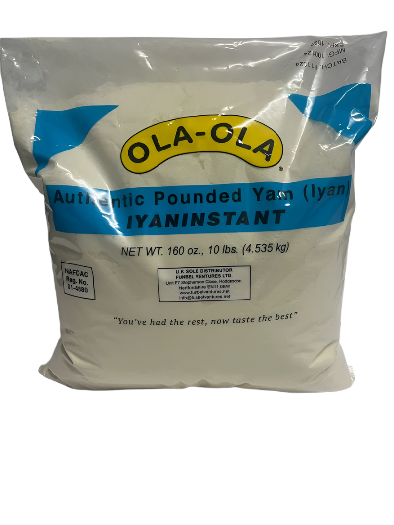 Ola Ola Iyan Pounded Yam offers 10 pounds of premium quality yam flour for authentic African cuisine. This finely milled powder produces smooth, lump-free pounded yam with perfect consistency when prepared. A staple for traditional West African meals, it provides convenient preparation without the labor of traditional pounding methods.